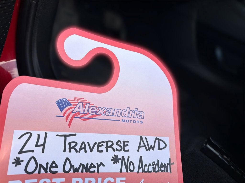 2024 Chevrolet Traverse Z71 AWD One Owner, Accident-Free, Certified SUVThis Radiant Red Tintcoat 2024 Chevrolet Traverse Z71 AWD is perfect for families or anyone seeking a capable, stylish, and reliable SUV. With a one-owner, accident-free CARFAX and CarBravo-Certified status, it delivers confidence and peace of mind. The 2.5L DOHC engine paired with an 8-speed automatic and AWD capability ensures smooth, efficient performance in all driving conditions, from daily commutes to weekend adventures.Key Features & HighlightsPerformance & Capability2.5L DOHC with 8-Speed Automatic transmission for smooth, responsive drivingAll-Wheel Drive provides confidence in rain, snow, or rough terrainZ71 trim adds rugged styling and enhanced suspension for capabilityComfort & ConvenienceSpacious interior for passengers and cargoFamily-friendly features with flexible seating optionsPremium Z71 touches for a refined cabin experienceTechnology & SafetyCarBravo Certified with 126-point inspection ensuring reliabilityRoadside assistance and courtesy transportation during warranty coverageAdvanced safety systems to protect passengersCertified CarBravo Program12-month/12,000-mile limited bumper-to-bumper warrantyWarranty effective following GM New Vehicle coverage expiration or immediately if prior coverage has endedRoadside assistance included for added peace of mindWhy Choose Alexandria Motors?We focus on transparency, value, and local trust with our one-low-price philosophy. Every vehicle includes a guaranteed key, and we provide a 7-day return or 30-day exchange policy on qualifying vehicles under 75k miles and 7 years of age. Serving Alexandria and the surrounding communities for over a decade, we make buying your next SUV simple, confident, and worry-free.3710 Hwy 29 S, Alexandria, MN 56308(320) 762-2114https://www.alexandria-cars.com/Stop by or call today to see this certified, one-owner 2024 Chevrolet Traverse Z71 AWD stylish, capable, and ready for every adventure.